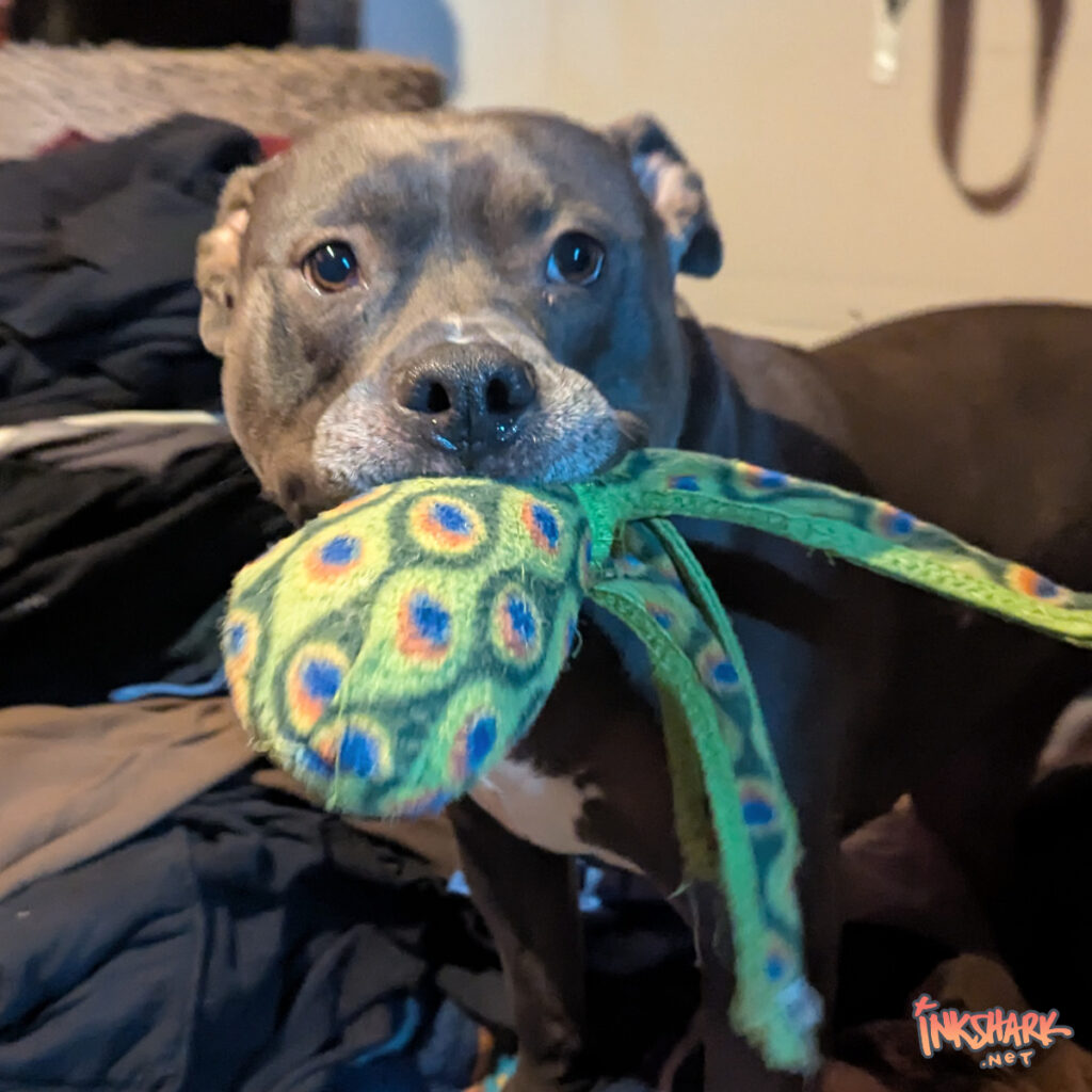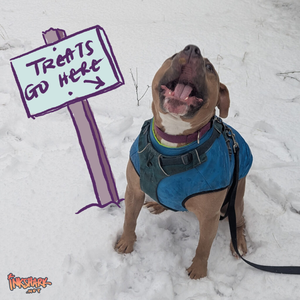 Left to right, top to bottom: Cedar, about to catch a tossed treat. Watson, majestically contemplating the snowy forest. Juniper, carrying around one of her favorite toys (which used to be Briar’s!). And Cedar wondering why i am crouching and playing with the rectangle instead of running down a snowy hill with him.